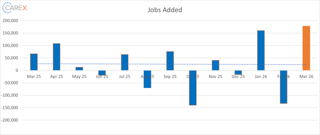 Let’s peel the onion. Healthcare again led job gains in March, adding 76,000 jobs (reflective as many healthcare workers returned from a strike). Construction services added 26,000 jobs; Leisure and Hospitality added 44,000 jobs; and transportation/warehousing added 21,000. Look a little deeper, though, and you’ll see several sectors actually lost jobs. So yes, overall job growth is positive. But we should be cautious about drawing broad conclusions based on a singular number. A handful of industries are doing the heavy lifting, and that’s not fully representative of a broadly strong labor market.