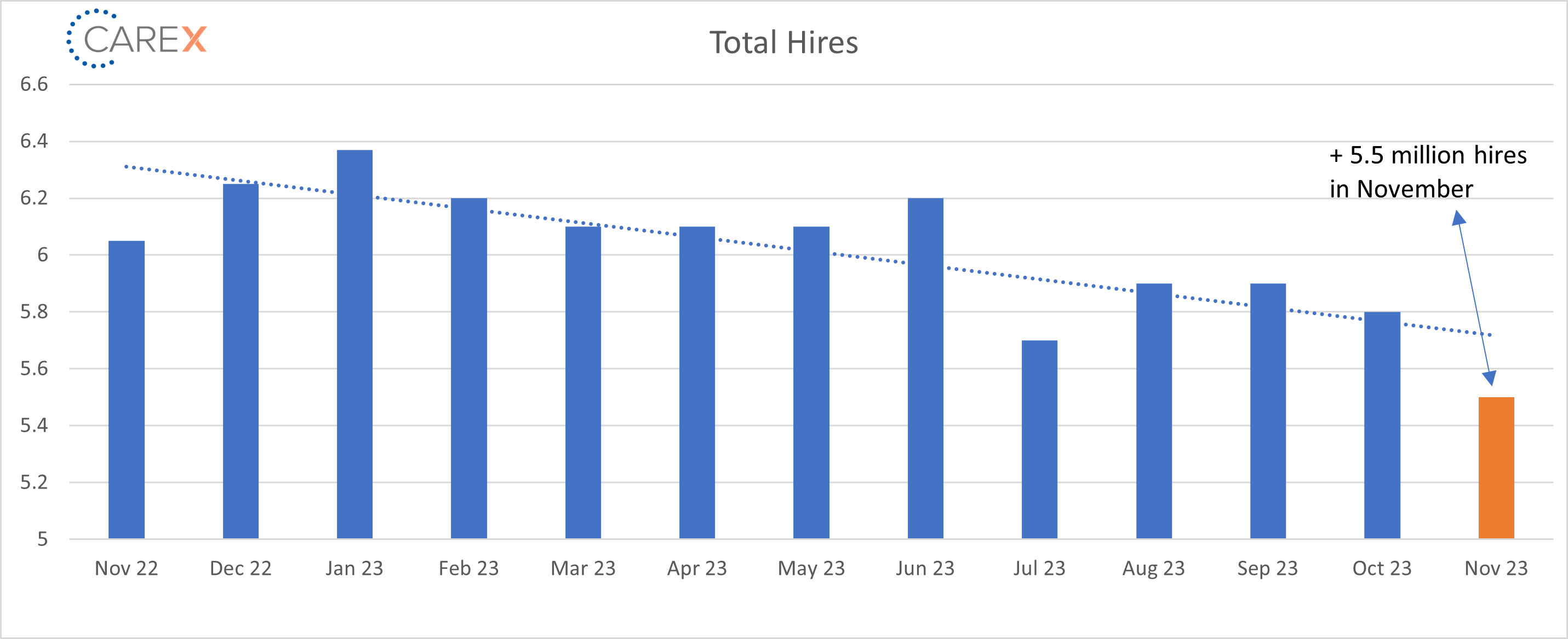- Hires decreased to 5.5 million, down from 5.8 million the previous month, and still lower from 5.9 million two months ago (chart above).