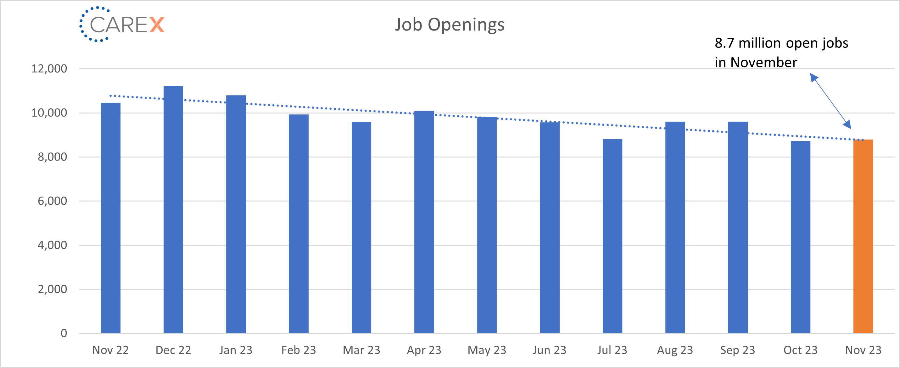 - Jobs per available worker fell to 1.4:1, down from 1.3:1 the previous month.