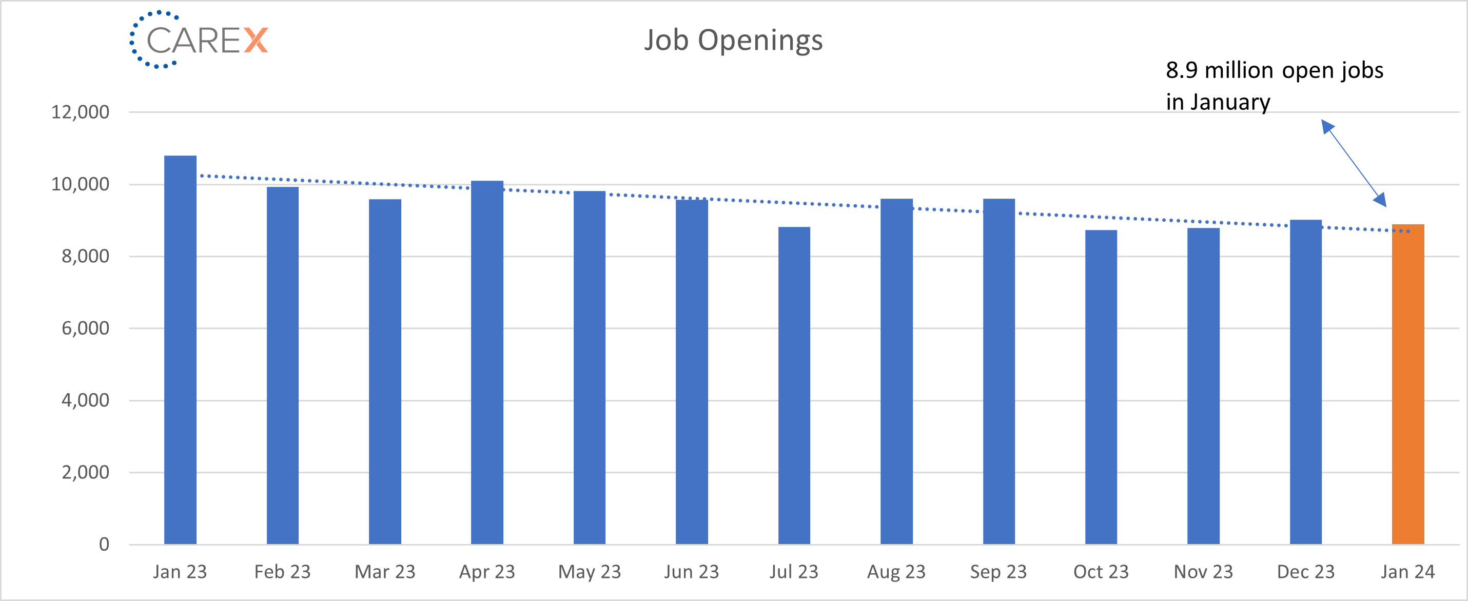 - Job openings fell to 8.9 million, down from 9.02 million the previous month.