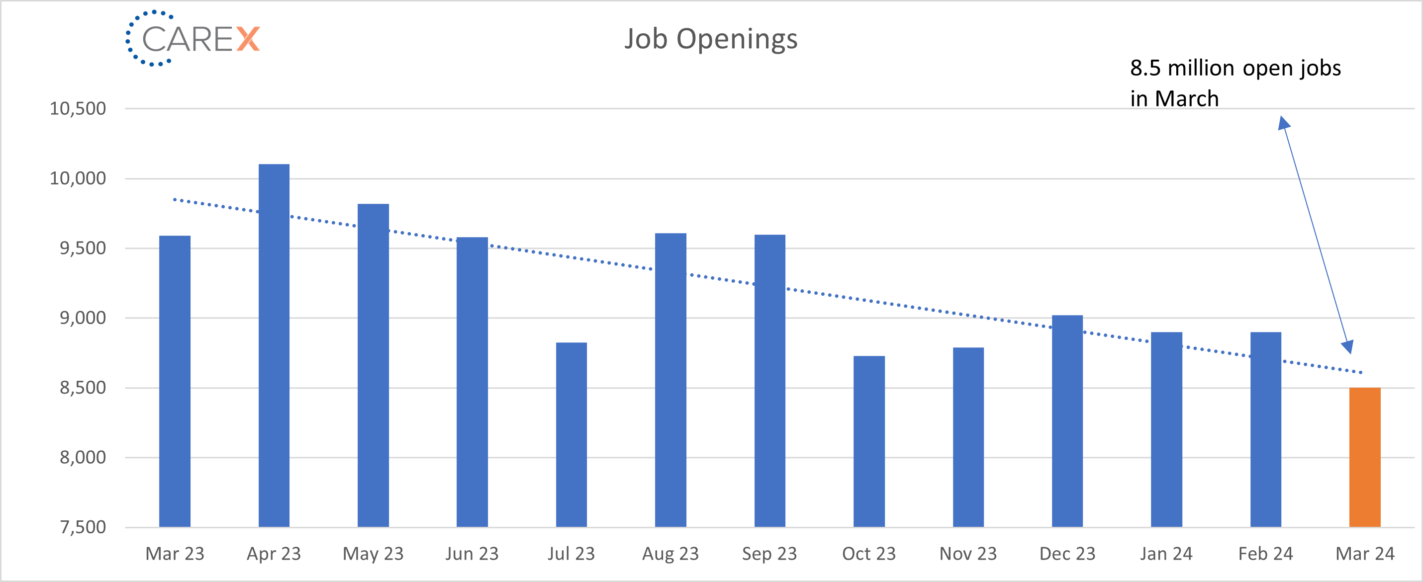 - Job openings peaked at a record 12.0 million in March 2022.