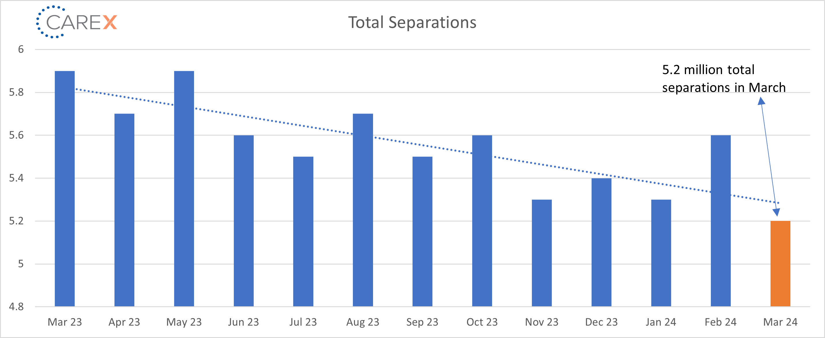 - Total separations fell to 5.2 million, down from 5.6 million the previous month.