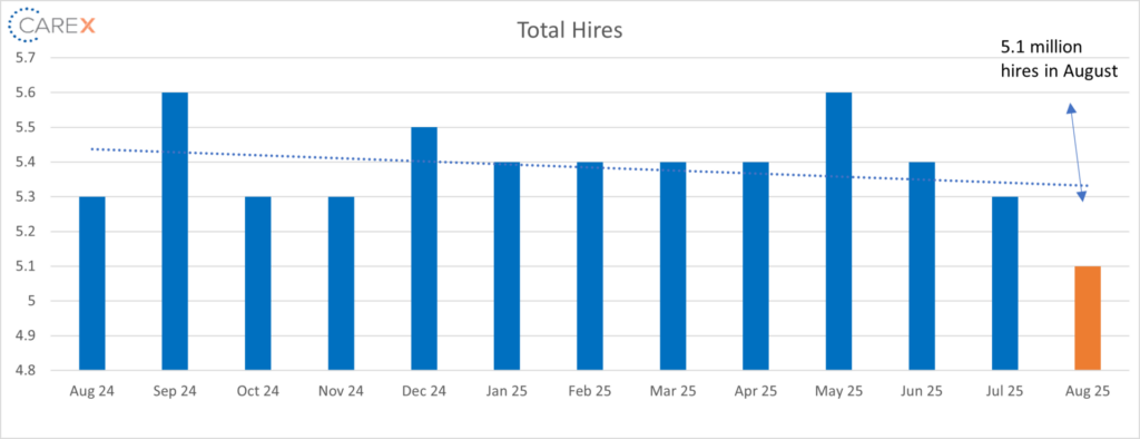 - Hires fell (again) to 5.1 million, down from 5.3 million the previous month