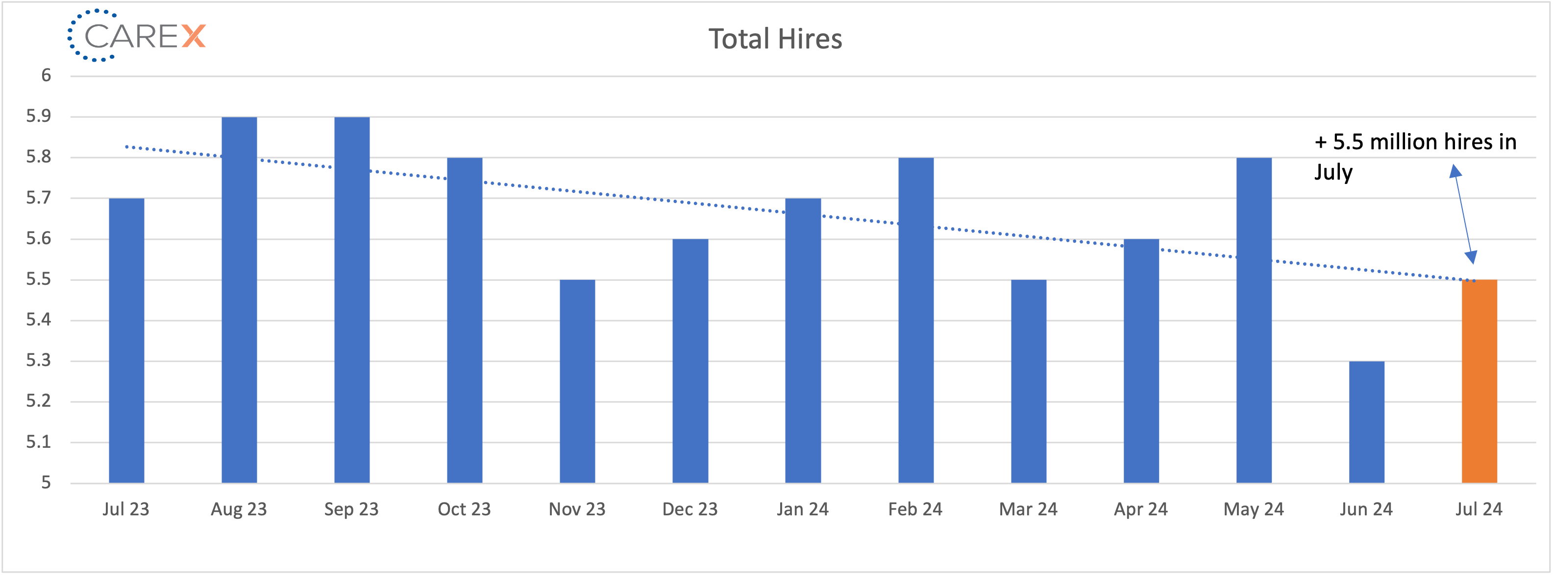 - Hires increased slightly to 5.5 million, up from 5.3 million the previous month (but down from 5.8 million three months ago)