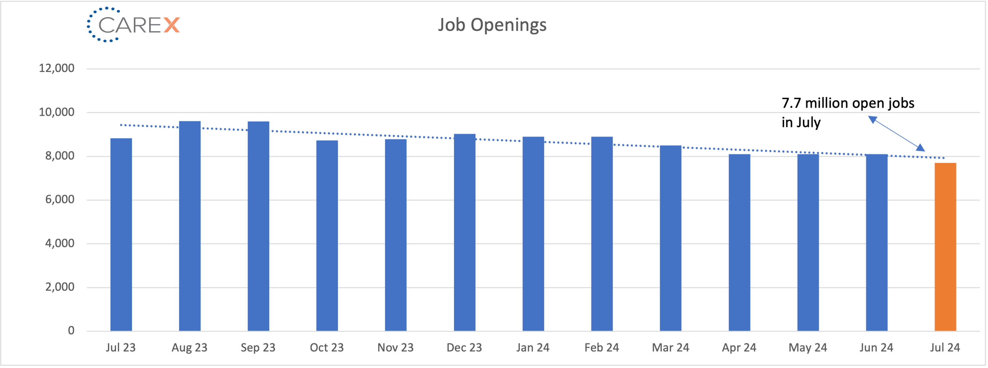 - Job openings dropped to 7.7 million, down slightly from 8.1 million the previous month