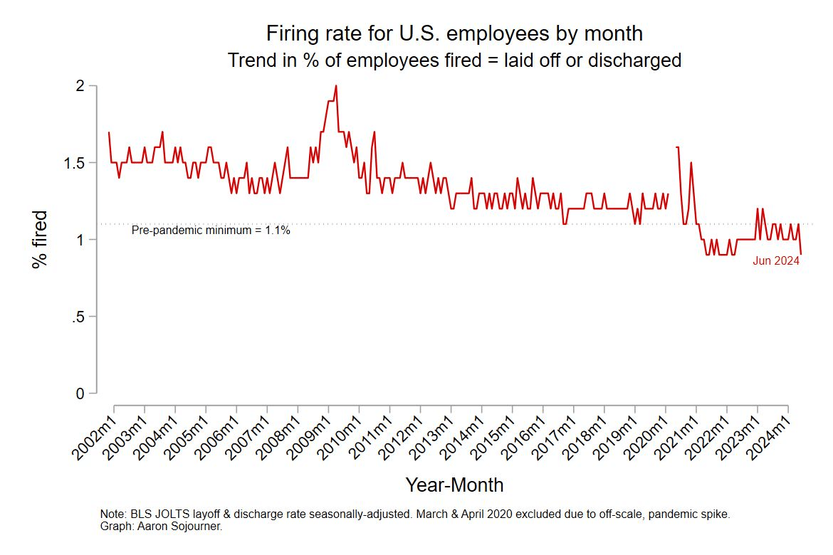 But it’s not all bad. The one silver lining is employee stability. By and large, companies (contrary to many headlines) are retaining their employees. In fact, companies are discharging employees at historic lows. Aaron Sojourner, with the W.E. Upjohn Institute for Employment Research, recently shared a graph that shows the trend line of laid off or discharged employees over the years (it’s still historically low).